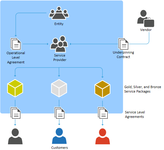 Service level agreements: A service level agreement is what an organization as a whole promises to an end user customer. The promise must be measurable, including the level of service, start and end times, and expected results. An example of a service level agreement is between an end user customer and you as an IT service provider. Refer to Working with Service Level Agreements.
