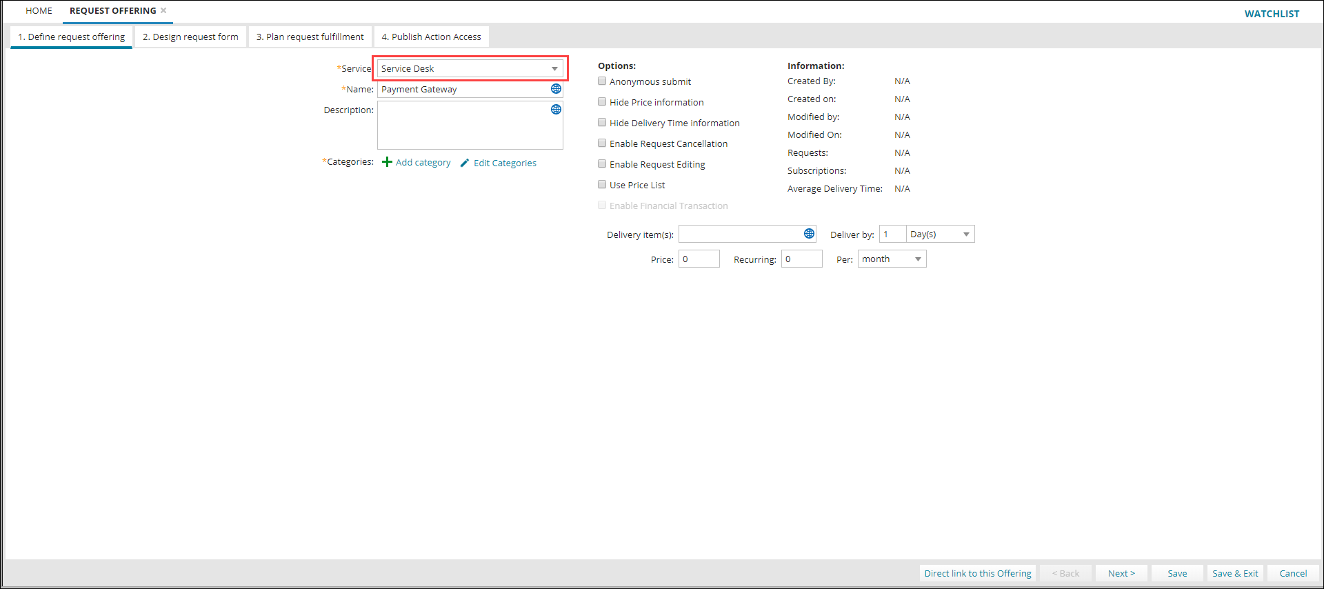 a. Click New > Request Offering. b. In the Define Request Offering tab, select the created service from the Service drop-down list, enter data in the mandatory fields and click Next. c. In the Design Request Form tab, select the required tools from the Form Designer Tools list and click Next. d. In the Plan Request Fulfillment tab, select the appropriate and click Next. e. In the Publish Action Access tab, click Add, select Published from the Status drop-down list, and click Save. -