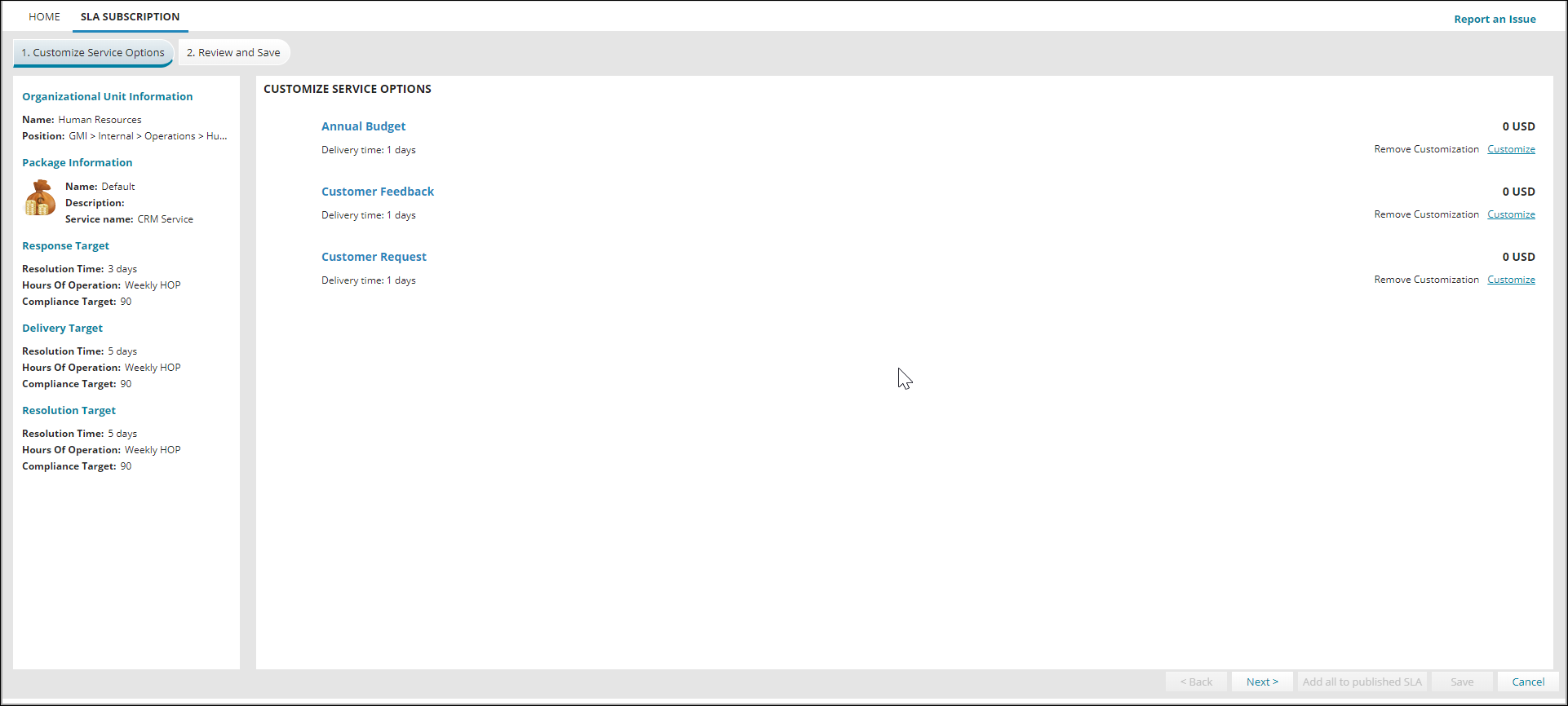 To modify the service package name, double-click the SLA, edit the details, and click Save.