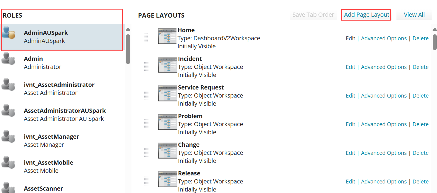 2.Select the role you want to set it up for under Roles and click Add Page Layout.