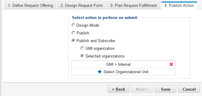•When configured as "Publish and Subscribe", users belonging to the indicated organizational unit have access to the request offering.