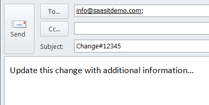 You can update an existing business object by sending an email with the business object type and business object ID as the subject and the updated information in the email body, using key/value pairs.