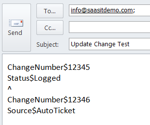 The following email updates two change records. Note that in the mailbox configuration, the value for the Unique Key field is ChangeNumber.