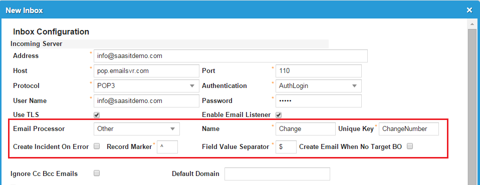 This feature allows you to configure the Neurons for ITSM email service to handle any generic business object except for service requests. You create an inbox for each business object type. So for example, all emails that are to create a task go to the task inbox, all emails that are to create a change go to the change inbox, etc.