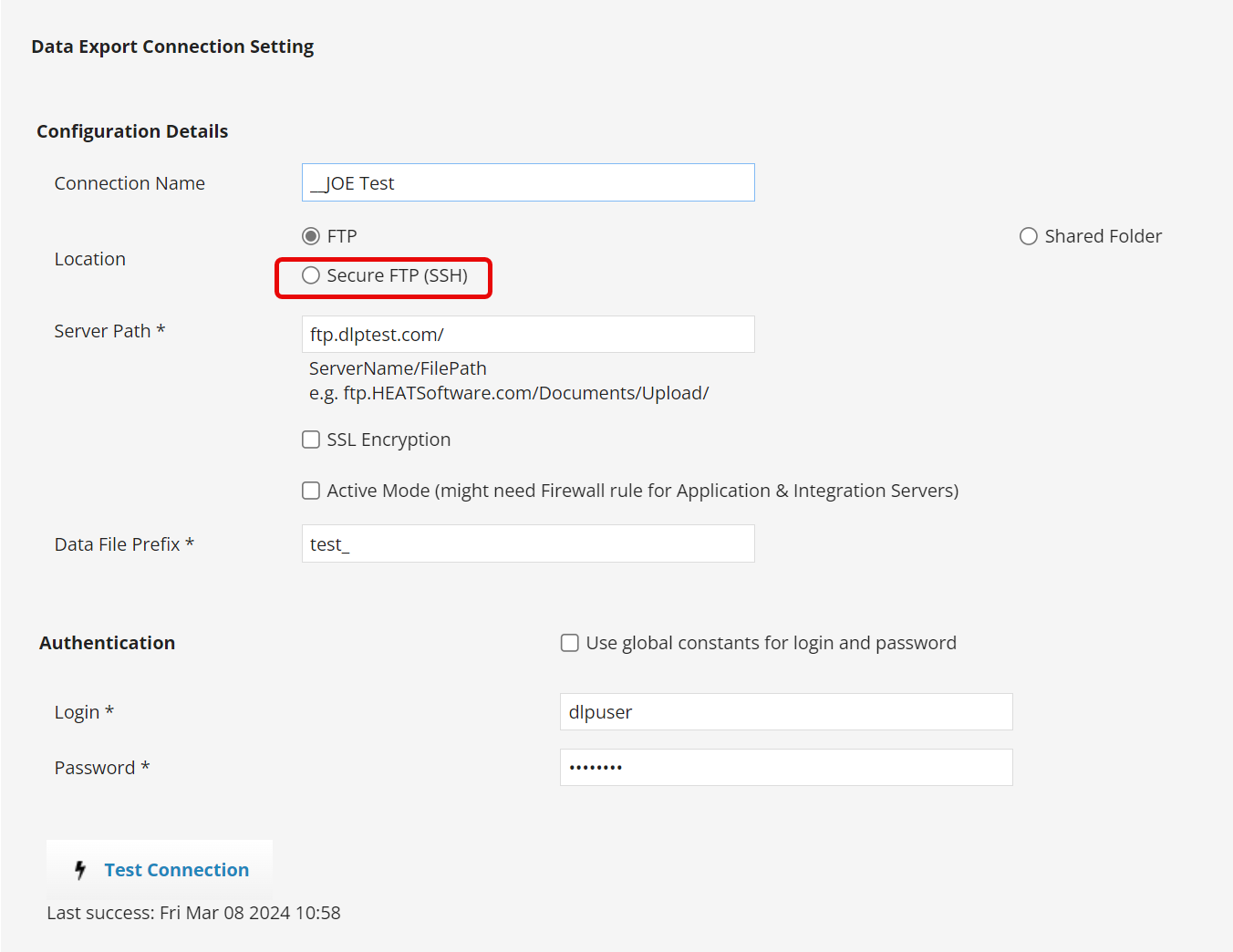 Appears when FTP location is selected. Creates a secure connection.