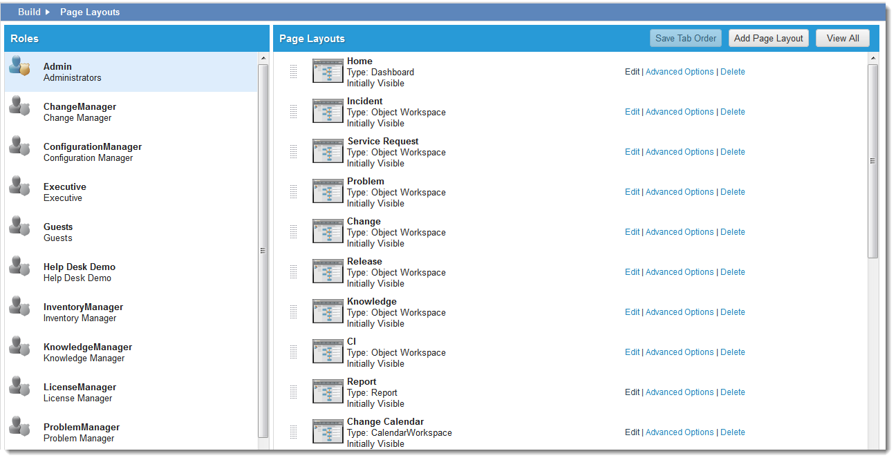 1.From the Configuration Console, click Build > Page Layouts to open the Page Layouts workspace. The application displays the list of roles and page layouts.