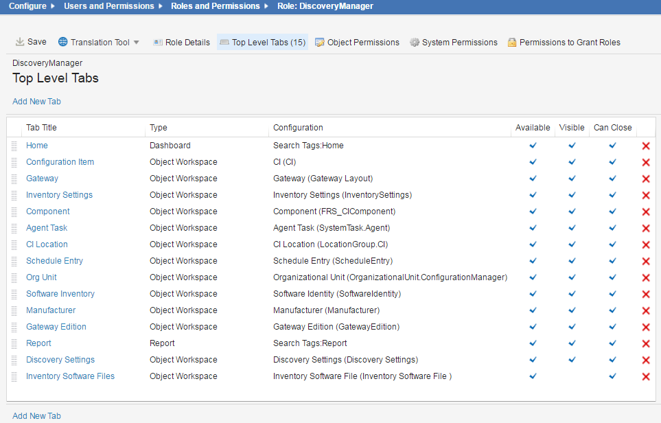 3.Click Top Level Tabs from the toolbar. The application displays the Top Level Tabs page, showing a list of the tabs that are currently available to that role.