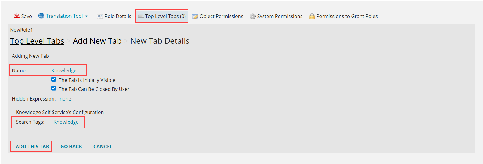 8.In Search Tags field enter Knowledge and click Add this tab.