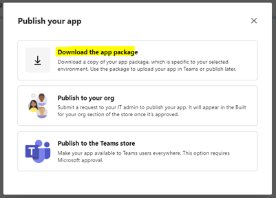 3.Select the Download the App Package from the pop-up to download the app package for the MS Teams Bot App.