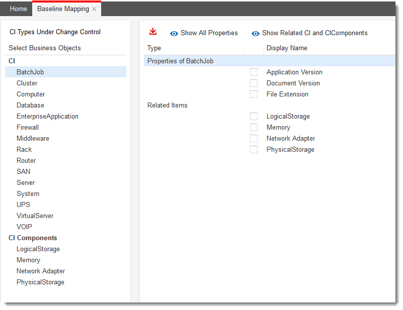 2.Open the Baseline Mapping workspace. A list of configuration item types and components appears.
