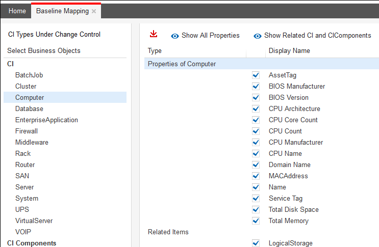 5.To baseline all configuration items related to the selected configuration item, click Show Related CI and CI Components, then check the ones to baseline.