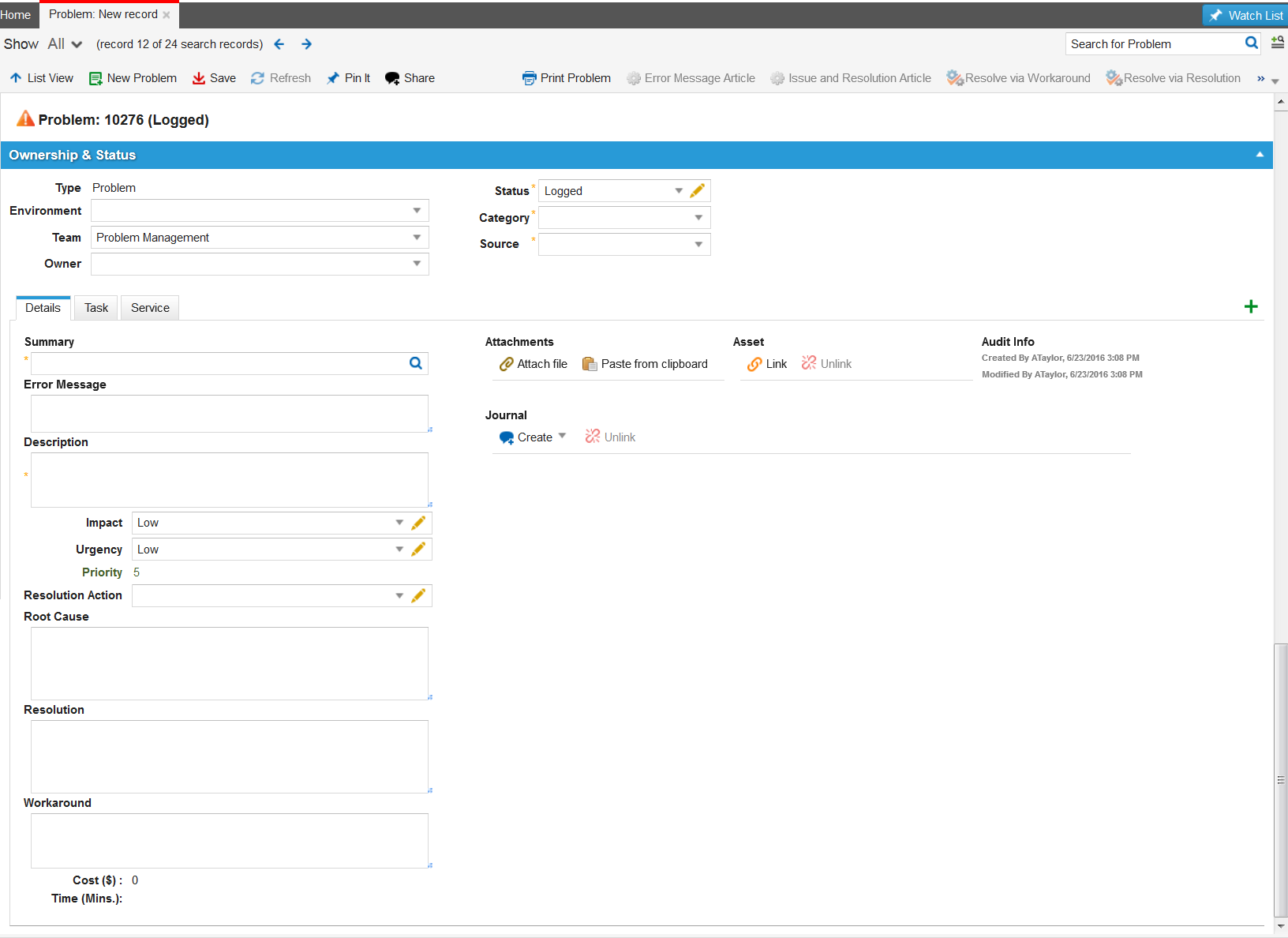5.Click Save. The problem is logged, and the system notifies the Problem Manager if either the impact or urgency of the logged problem is high.