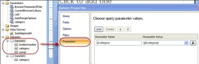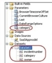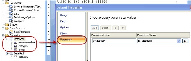 6.Enter your query. For example, a simple query to get all incidents by categories, showing the incident number and owner is as follows: Select incidentnumber,category,owner from incident where category in (@category). In this example, @category is taken by Microsoft SSRS as a parameter. When running the query, the system prompts you for the value. You can provide any value to test the query. The system automatically creates the category parameter and automatically maps it to the dataset.