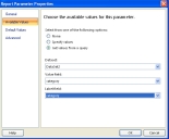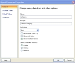 1.From the left Report Data pane, under Parameters, select the parameter that you created, then right-click and select Parameter Properties. The system displays the Report Parameter Properties dialog box.