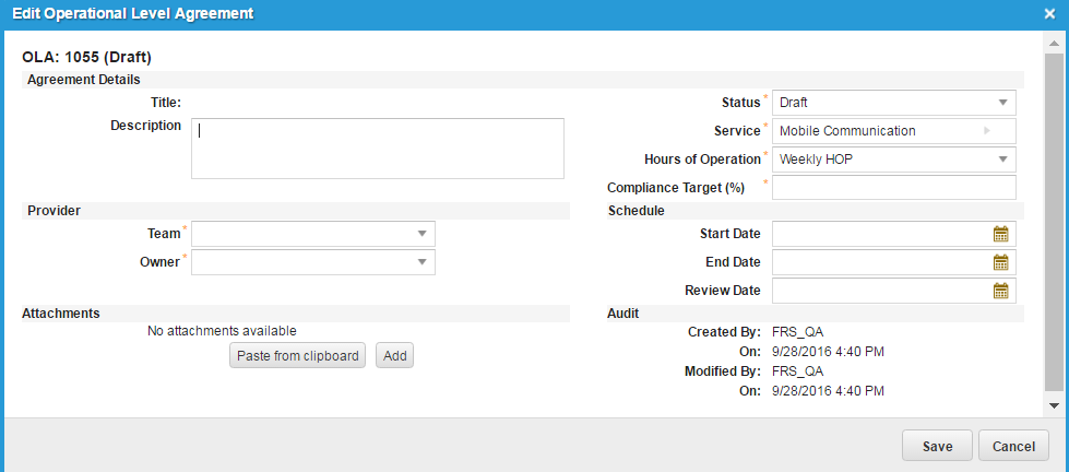 This field is automatically populated by the system after you select a team. Description A brief description of the operational level agreement. Team The provider team. Select from the drop-down list. Owner The provider owner. Select from the drop-down list. These values are derived from the selected team. Status The initial status setting. Select from the drop-down list. Service The service that this operational level agreement is related to. This field is automatically populated based on the selected service. Hours of Operation The hours of operation for the service. This field is automatically populated based on the selected service but you can also select an option from the drop-down list. Compliance Target (%) The percentage of completion that is required to fulfill the target. Start Date