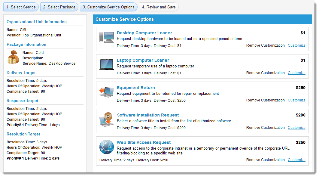 Review the Service Level Package. To modify any part of the package, click change next to an option and edit it.