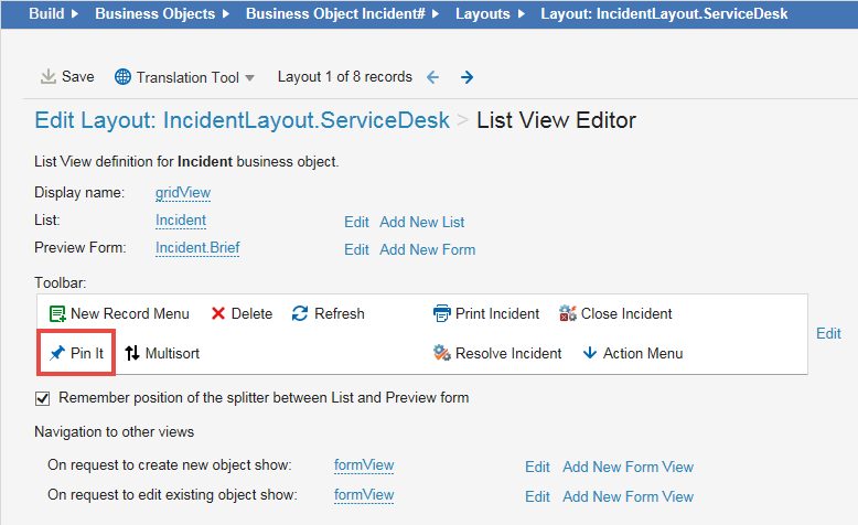 10.You can view your object in list view or form view. For this example, click gridView. The list view editor appears. If Pin It does not appear in the toolbar area, you can add it. Refer to Using the Toolbar Editor.