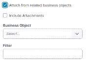 Allows you to attach a related business object. Select the Include Attachments checkbox, and then select a business object from the Business Object drop-down list.