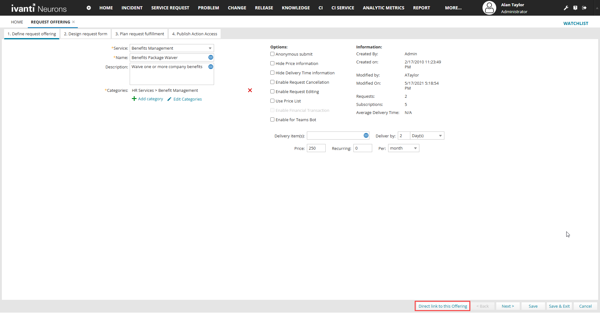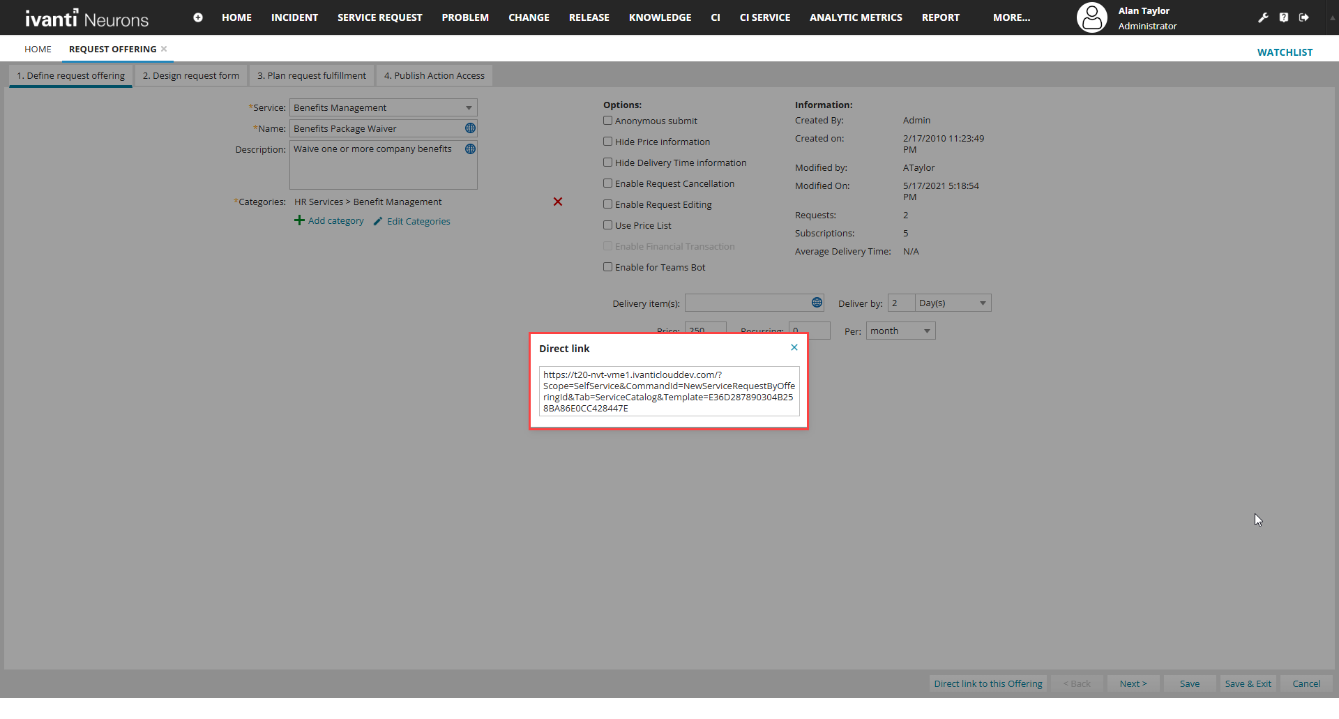 In the bottom of the Request Offering form select Direct link to this offering button that prompts the direct link to the offering.