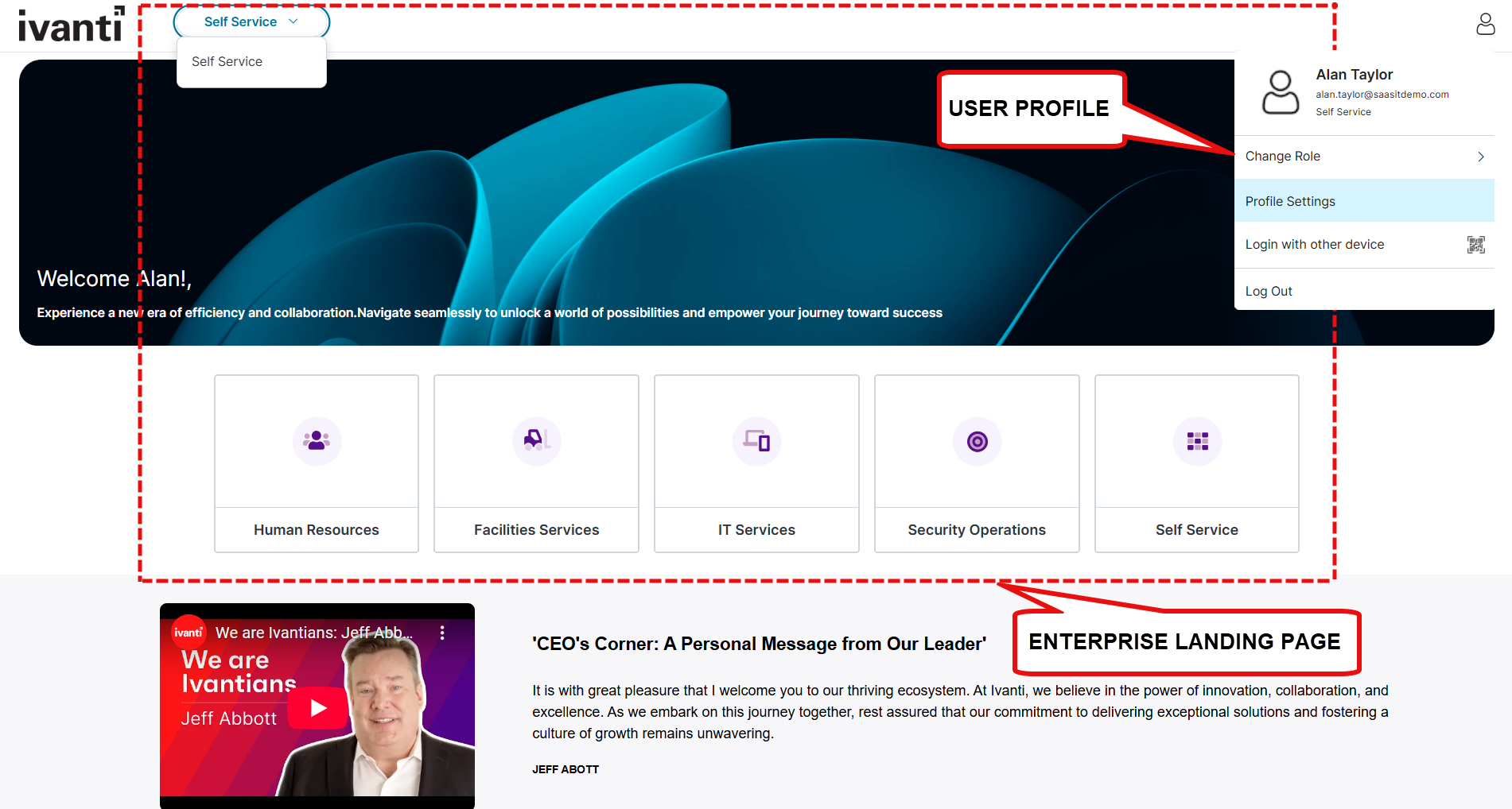 The Enterprise Landing Page provides a centralized navigation hub for accessing various Self Service portals or business areas such as HR, IT, or Marketing.