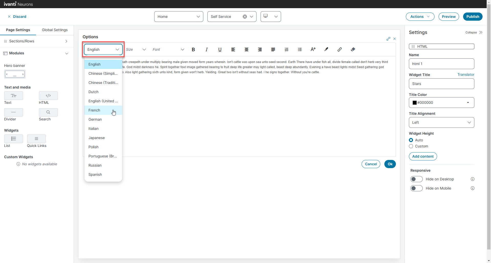 Use the Modules tab to create custom widgets, hero banners, search bar, add text and media, and quick links.