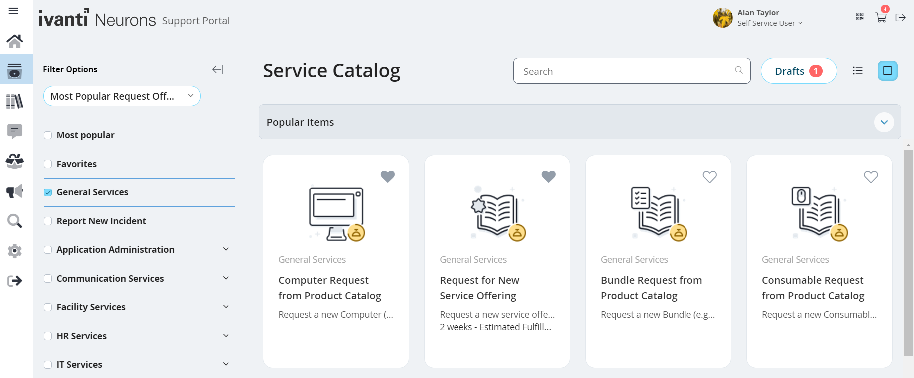 Service Catalog choices and forms depend on how your company configured Neurons for ITSM. See Default Catalog Offerings to know the list of Service Catalogs available out-of-the-box.