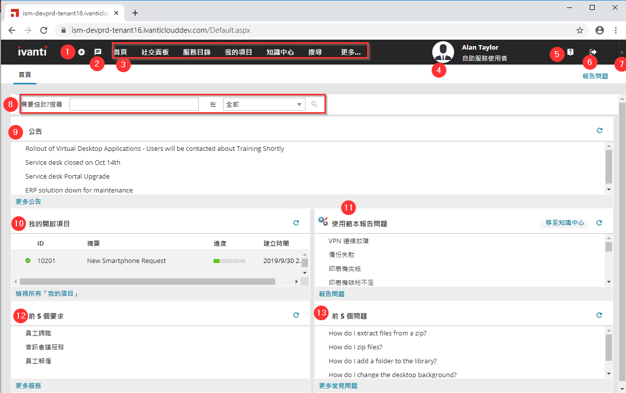 12. 前 5 大要求 - 使用者最常提交的服務要求。 您可以在提交要求時從此清單中選擇,也可以按一下更多服務 (位於區段底部) 以開啟「服務目錄」並搜尋所有要求類別。