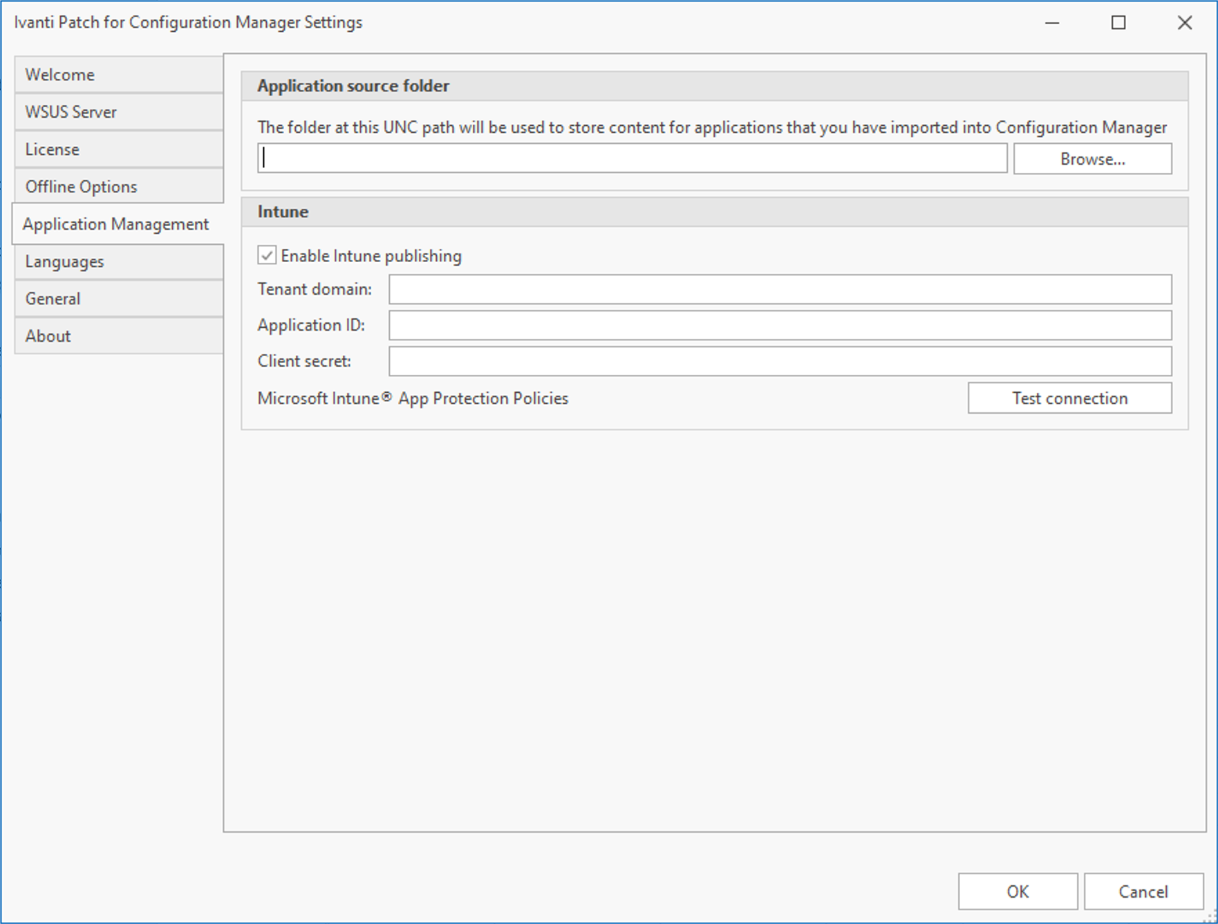 The Application Management tab allows you to specify the folder to use when deploying third-party applications. In addition, you can specify if publishing to Intune is allowed and, if so, how to make a connection with your Intune environment.