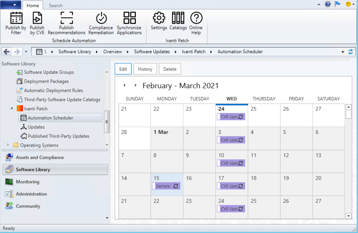 - Within the Configuration Manager Software Library workspace, expand the Software Updates > Ivanti Patch folder and then click on Automation Scheduler.