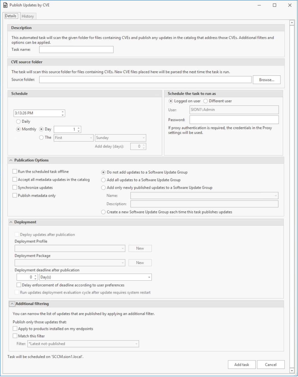 - Add only newly published updates to a Software Update Group: Only newly published updates specified in the scheduled task will be added to a software update group.
