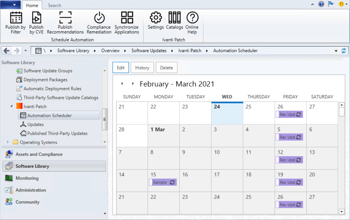 - Within the Configuration Manager Software Library workspace, expand the Software Updates > Ivanti Patch folder and then click on Automation Scheduler.