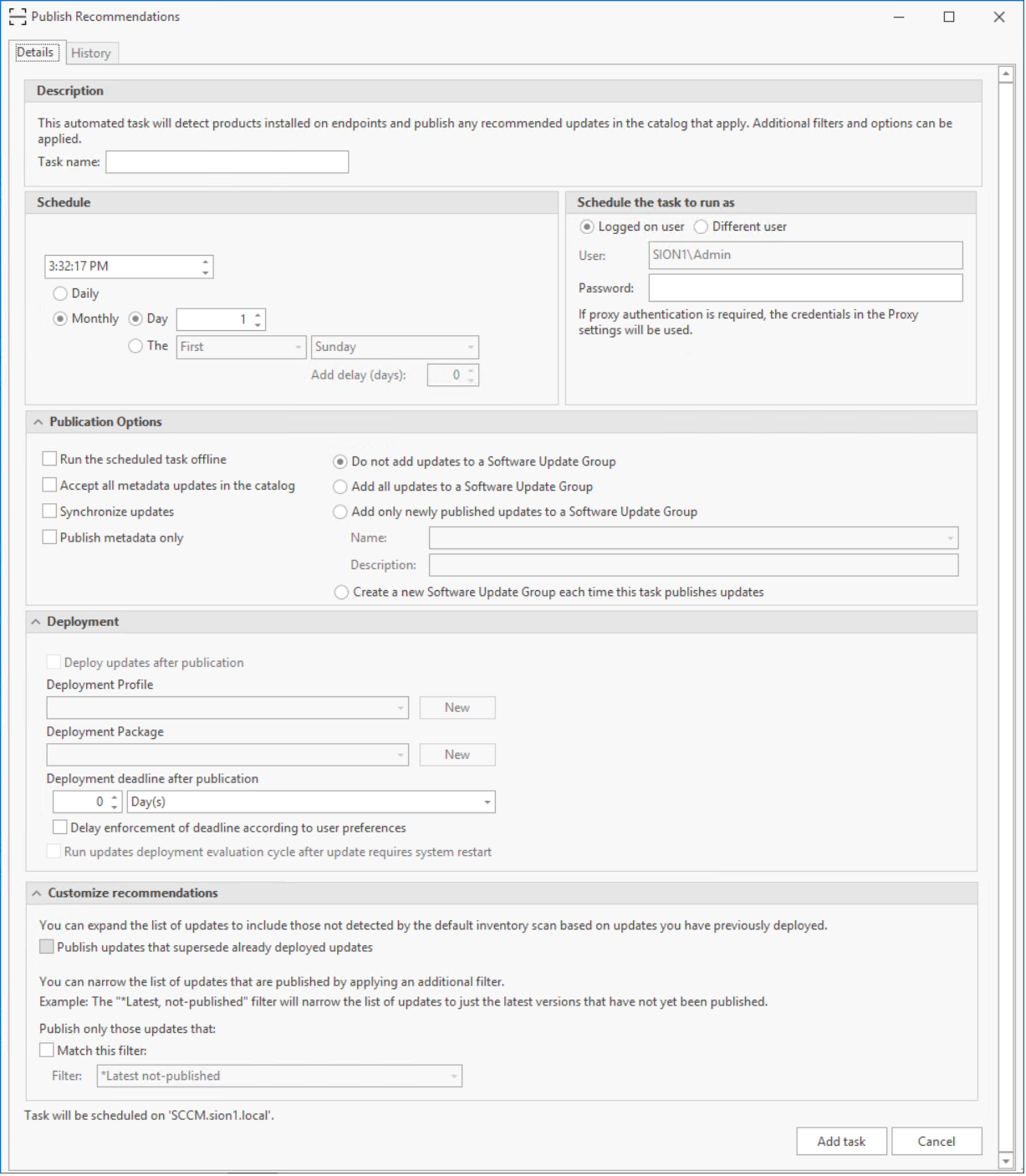 This automated task will detect products that are contained on your client machines, and it will then publish updates that apply to those products. It does this using a Recommended Updates filter that is automatically generated for you each time the task is run. The task uses the filter to identify which updates to publish for the detected products. You can choose to apply an additional filter to narrow the list of updates that get published, and you can configure a number of options that allow you to perform additional tasks. This process is repeated on a recurring basis according to the schedule that you configure.