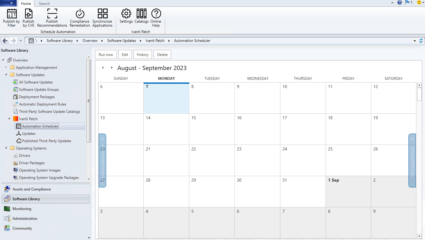 - Within the Configuration Manager Software Library workspace, expand the Software Updates > Ivanti Patch folder and then click on Automation Scheduler.