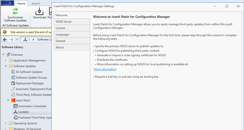 Installing the Patch for Configuration Manager plug-in will add three new workspaces to the Software Library > Software Updates > Ivanti Patch folder. The new workspaces are named Automation Scheduler, Updates and Published Third-Party Updates. The first time you try to access one of these workspaces, the setup wizard will be launched.
