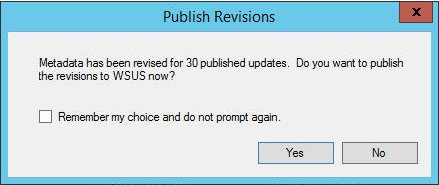 • Prompt me when metadata revisions are available: If new metadata becomes available for updates that you have previously published, a dialog will be displayed that provides you with the option to either immediately revise the updates in WSUS or ignore the new metadata. For example
