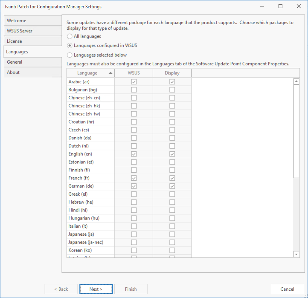 Often, a single update may be applied to any language version of a product. Some updates, however, have a different update package for each language that the product supports. The Languages tab lets you choose which languages you are interested in for these language-specific updates. The languages you choose control which language versions will be displayed in the Patch for Configuration Manager grid.