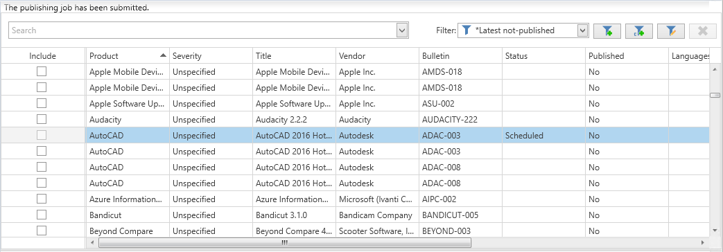 The Include check box will be disabled if the latest revision of the update has already been published or has recently been scheduled for publication. - Use a filter