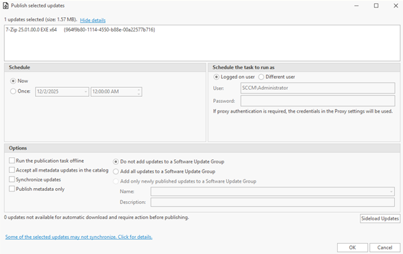 - Sideload Updates: If this button is available, it means that one or more of the selected updates are not available for automatic download. Those updates must be sideloaded before they can be published. Click this button to see which updates must be sideloaded.