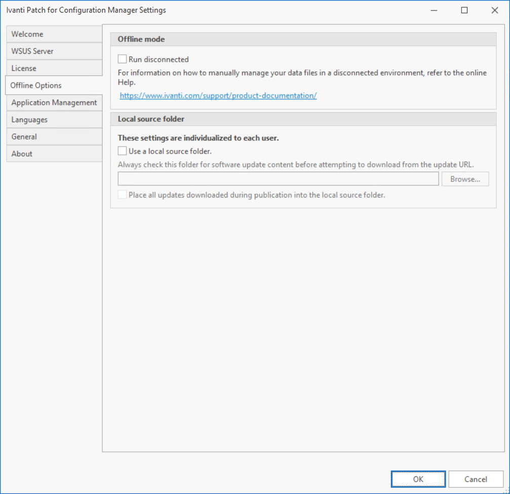 This area provides the option to run Patch for Configuration Manager in offline mode. To set offline mode, enable the Run disconnected check box.