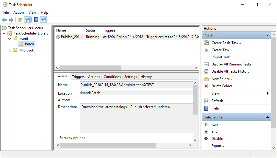 To access Patch for Configuration Manager scheduled tasks, select Start > Administrator Tools > Task Scheduler > Task Scheduler Library > Ivanti > Patch. One-time tasks can be run, deleted, disabled, or rescheduled.
