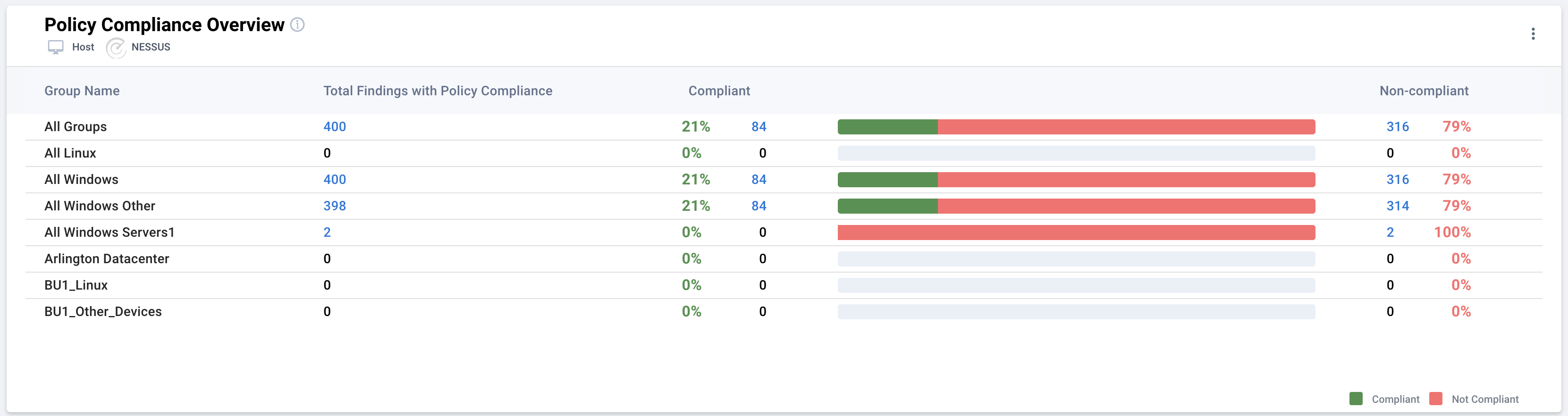 The Policy Compliance Overview widget displays the number of host findings that are compliant and non‑compliant across different groups. The information shown is based on the selected specific group.