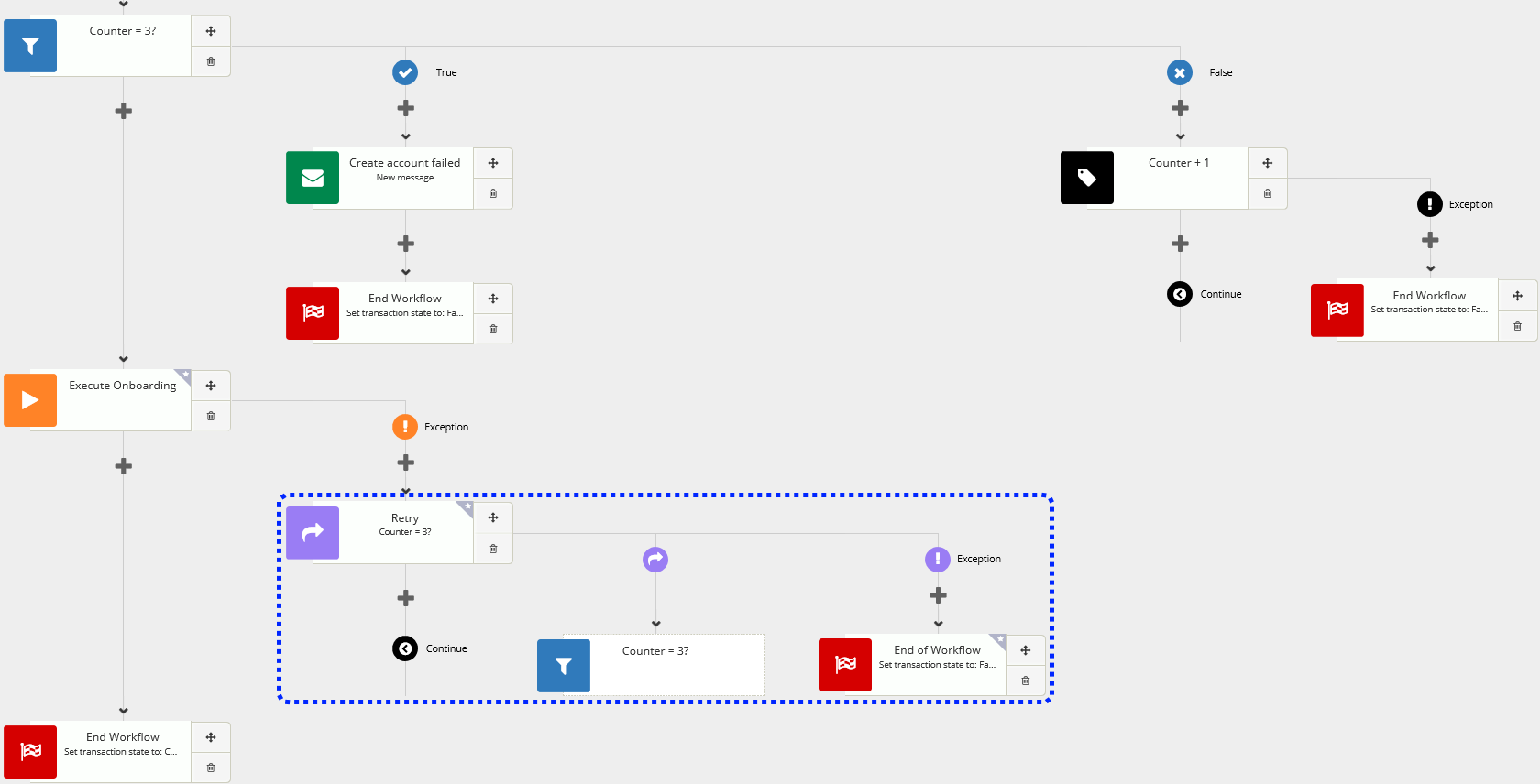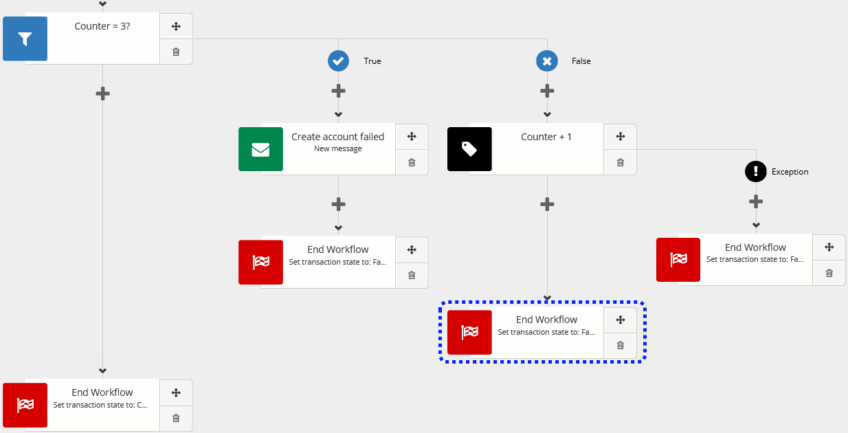 - Add an End Workflow action that sets the status of the transaction to Failed.