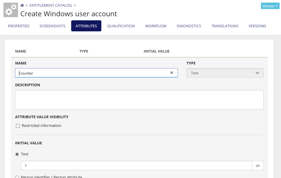 - The service placeholder #Service[Counter.Value] in the Compare Attributes action is compared if it equals "3". Because this is the first attempt to create a Windows user account, the value is 1.