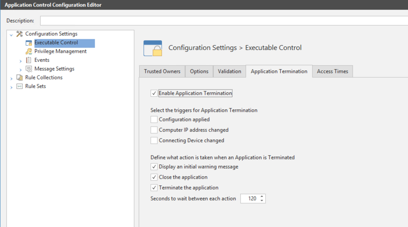 Application Termination is disabled by default. To enable the feature select Enable Application Termination on the Configuration Settings > Executable Control > Application Termination tab.