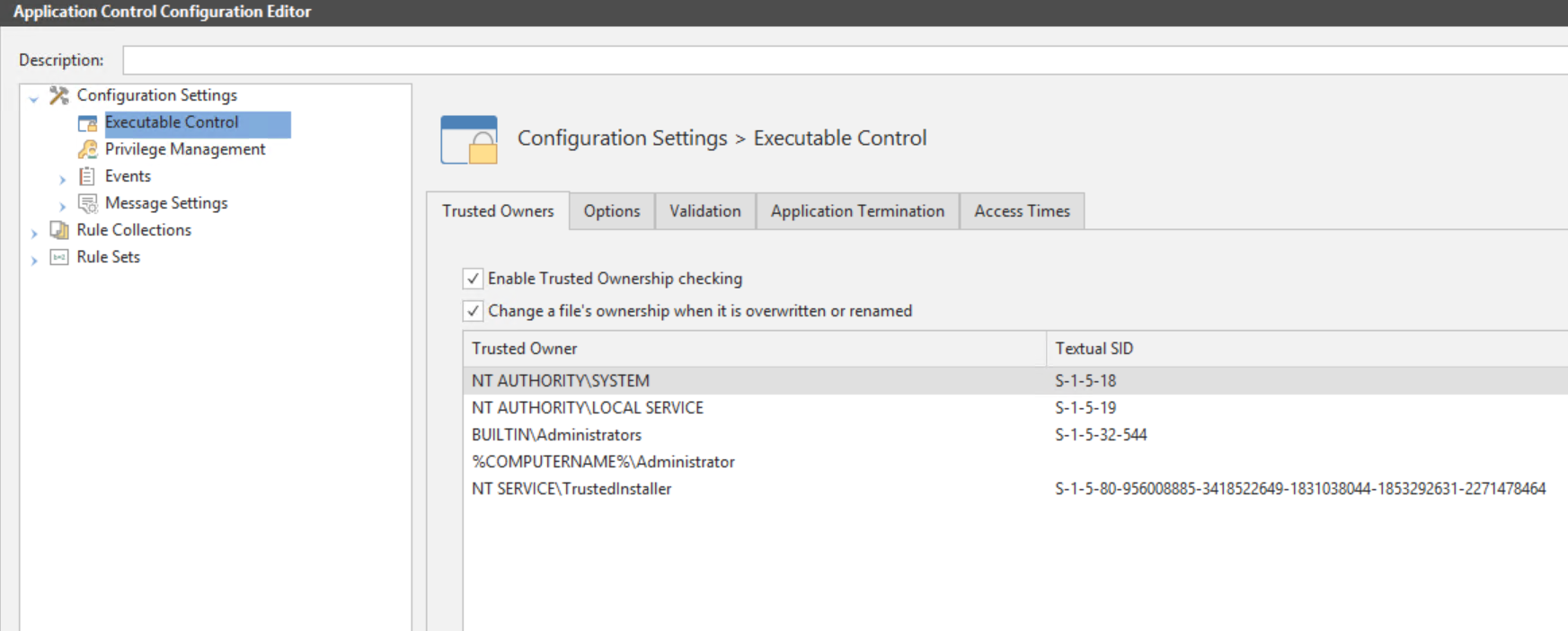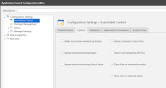 The Configuration Settings Executable Control node contains five tabs; Trusted Owners, Options, Validation , Application Termination and Access Limits.