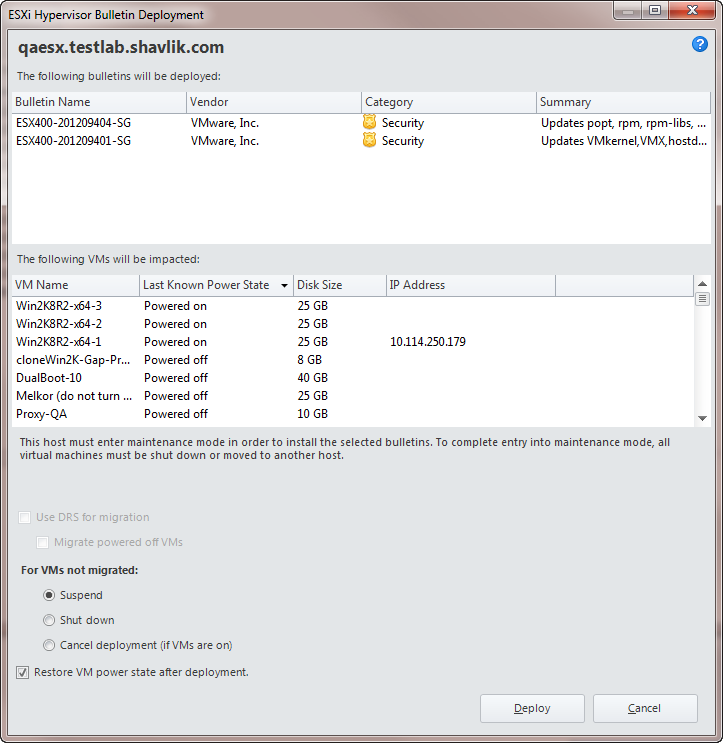 The following options apply only if one or more of the bulletins being deployed will have an impact on the virtual machines and hypervisor. |