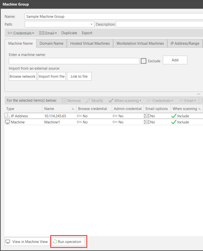 After creating and configuring the machine group, to initiate a patch scan you simply click Run Operation. On the Agentless Operation page, verify the default options and then click Scan Now. This will immediately begin a scan of all machines in the machine group. (For other options see How to Initiate a Patch Scan.)