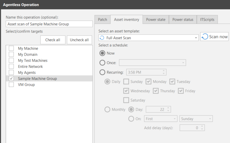 When you initiate an asset operation from a machine group or from a Favorite the Agentless Operation dialog is displayed. This dialog enables you to specify if the operation should run now or be scheduled for a future time or date.