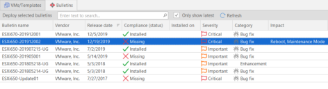 The Bulletins tab displays the status of the security bulletins that have been issued for the ESXi hypervisor(s) selected in the top pane. If multiple hypervisors are selected in the top pane, this tab will display bulletin information for all selected hypervisors.