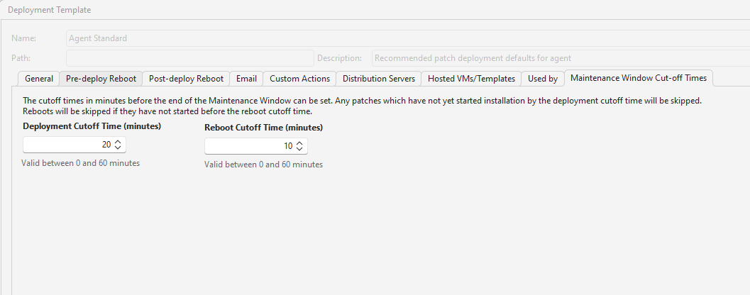 Deployment Cutoff Time: Time in minutes before window ends to stop launching new deployments. If a patch installation is not started by the specified number of minutes before the maintenance window ends, it is excluded.